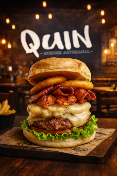 ¡Una bestia salvaje solo para los más valientes! 🦖💥 Doble carne de 150g, mix de quesos en cada carne, full bacon ahumado, chorizo de ternera, aros de cebolla apanados, vegetales, salsa tártara y smoke. ¡El monstruo de Quin!