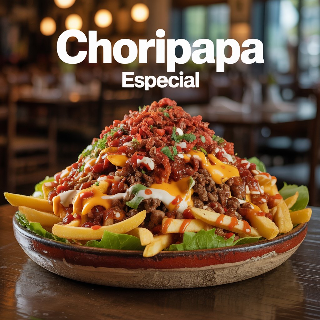 Papa a la francesa, chorizo cóctel, carne de hamburguesa, queso, lechuga, papa cabello de ángel y salsas.