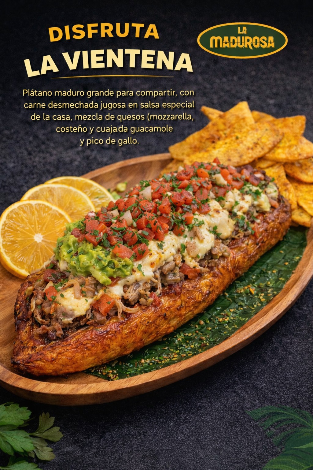 Plátano maduro grande para compartir con carne desmechada, chicharrón crocante, guacamole, pico de gallo, maíz tierno y triple mezcla de quesos. domicilios villanueva, domicilios barranca upica, Clico