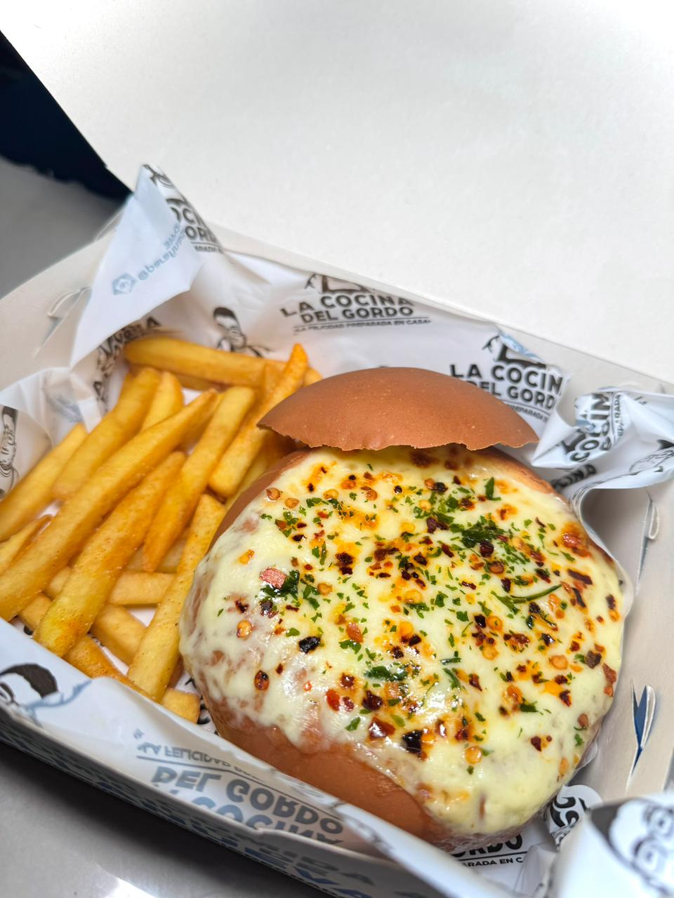 Pan artesanal, mix de pollo y cerdo desmechado con una salsa especial, maíz, queso mozzarella gratinado y papas francesas, domicilio villanueva casanare – barranca upia