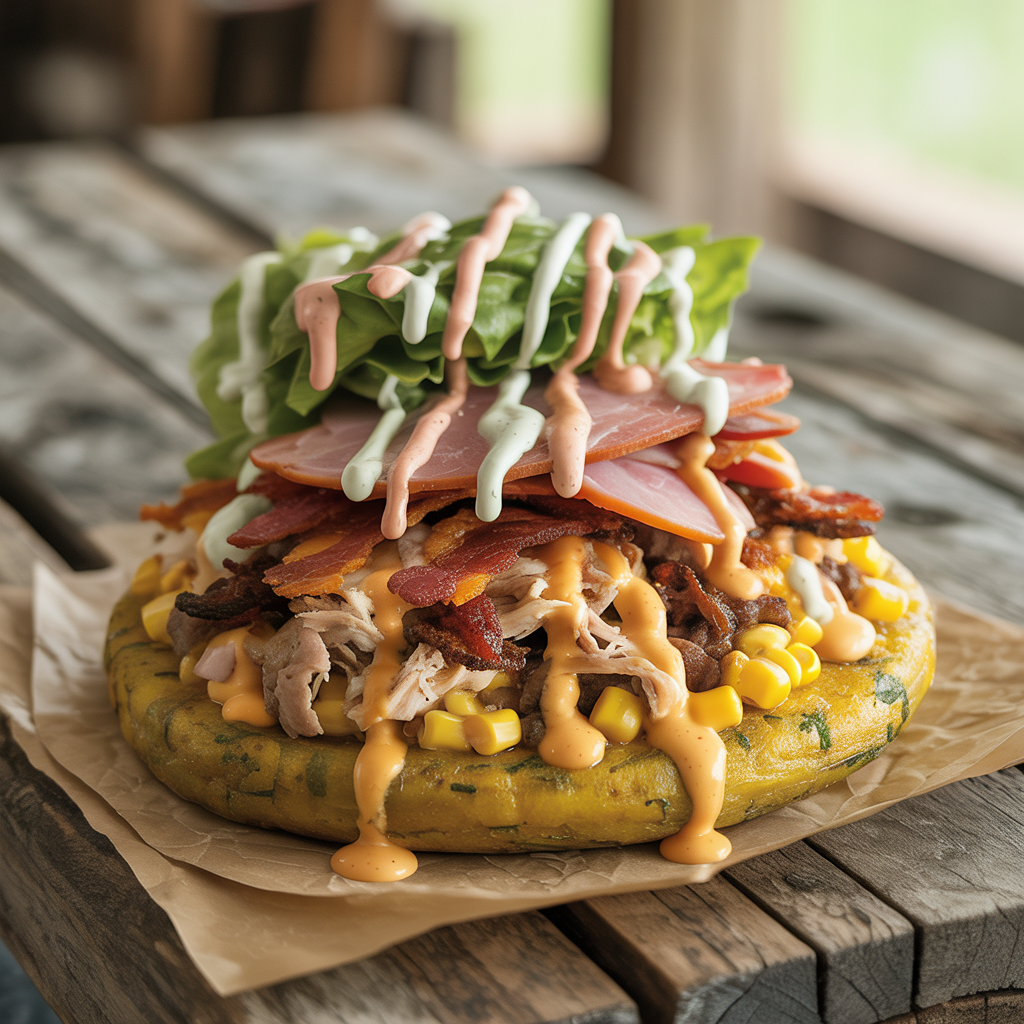 Pollo, carne, jamón, queso, lechuga, papa ripio y salsas, hogao de la casa.