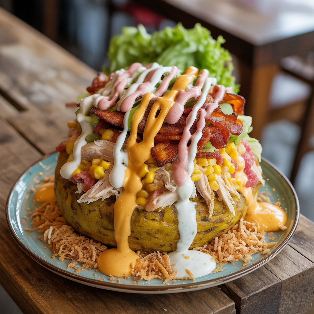 Pollo, carne, maíz tierno, tocineta, chorizo cóctel, jamón, queso, lechuga, hogao de la casa, papa ripio y salsas.