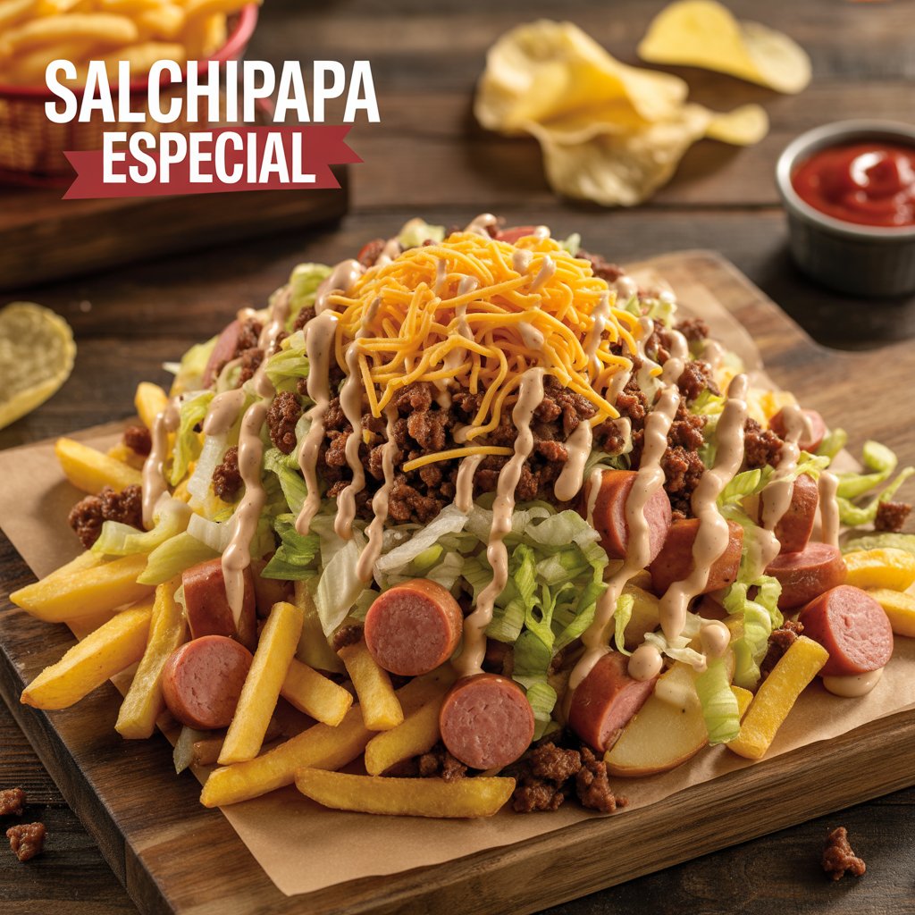 Papa a la francesa, salchicha americana, queso, lechuga, carne de hamburguesa, papa cabello de ángel y salsas.