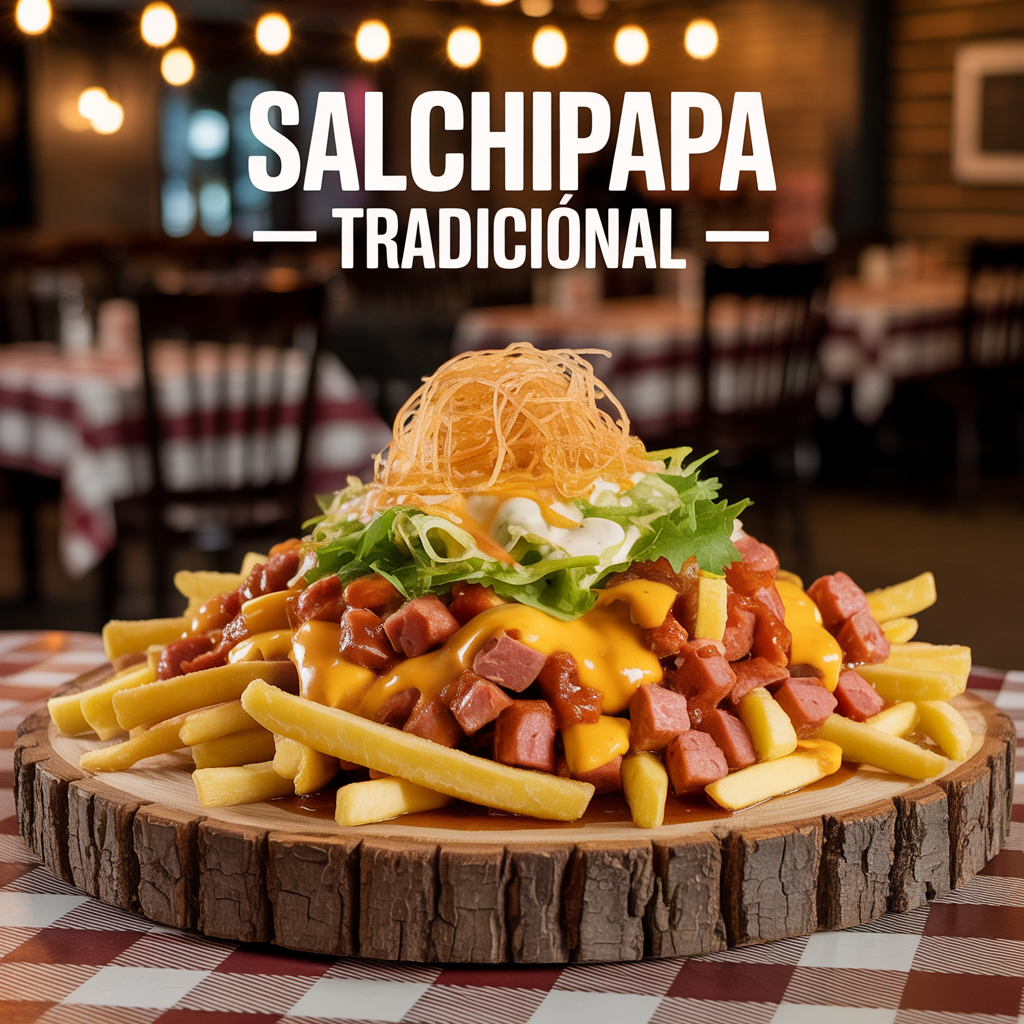 Papa a la francesa, salchicha americana, queso, lechuga, papa cabello de ángel y salsas.